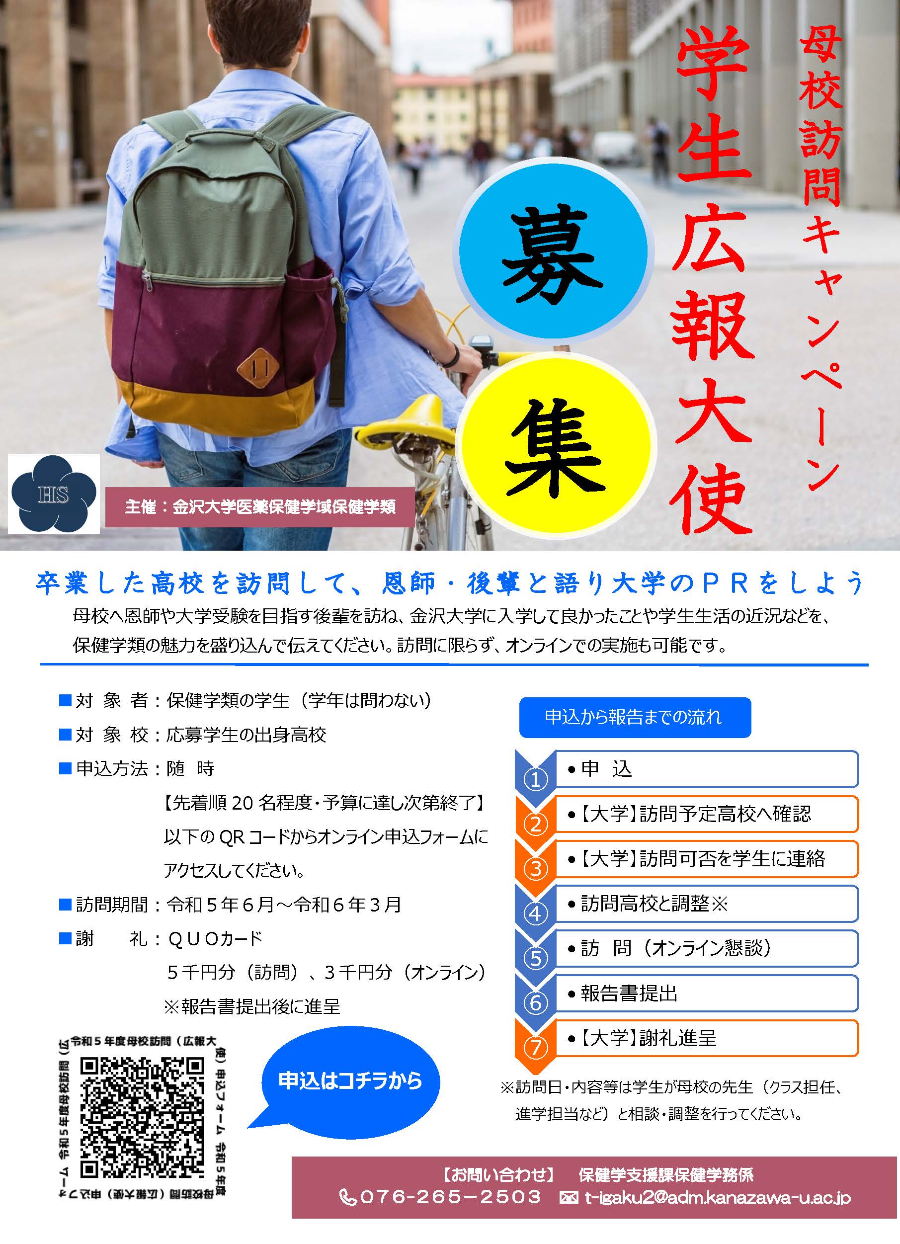 母校訪問キャンペーン「学生広報大使」の募集について 母校訪問キャンペーン「学生広報大使」を募集します! 卒業した高校へ恩師や大学受験を目指す後輩を訪ね,金沢大学に入学して良かったことや学生生活の近況などを, 保健学類の魅力を盛り込んで伝えてください。訪問に限らず,オンラインでの実施も可能です。【謝礼:QUOカード】 対象者 保健学類の学生(学年は問いません。) 対象校 応募学生の出身高校 申込方法 随時【先着順20名程度・予算に達し次第終了】 申込フォームよりお申し込みください。 その他詳細については,こちらをご確認ください。 ≪ 前のページに戻る << 前の記事 一覧に戻る 次の記事 >>